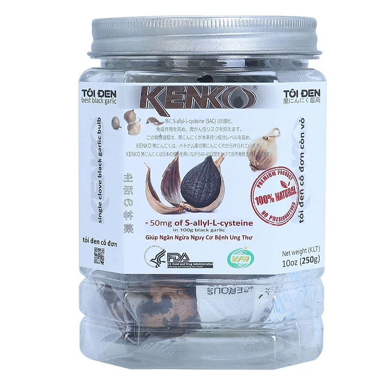 Thực Phẩm Chức Năng Tỏi Đen Còn Vỏ KENKO Đựng Trong Hũ Nhựa Nắp Nhôm - 250g được lên men từ tỏi cô đơn trong thời gian 45 ngày, sản phẩm tỏi đen có màu đen, vị ngọt, không còn mùi cay hăng, rất tốt cho việc chữa trị bệnh.