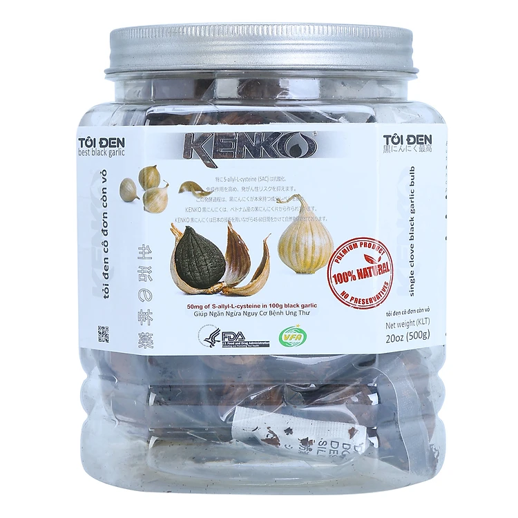 Thực Phẩm Chức Năng Tỏi Đen Còn Vỏ KENKO Đựng Trong Hũ Nhựa Nắp Nhôm - 500g được lên men từ tỏi cô đơn trong thời gian 45 ngày, sản phẩm tỏi đen có màu đen, vị ngọt, không còn mùi cay hăng, rất tốt cho việc chữa trị bệnh.
