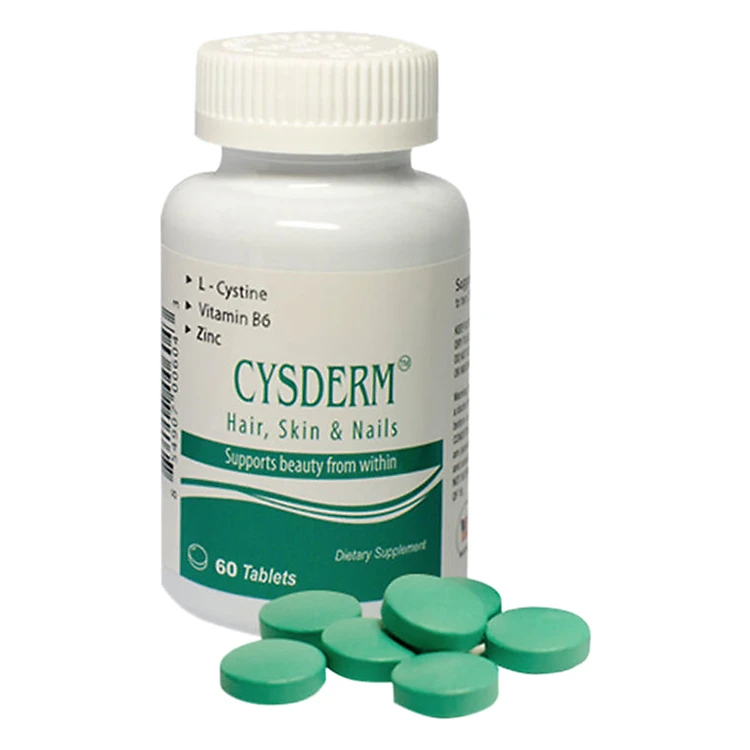 Thực Phẩm Chức Năng Viên Uống Hỗ Trợ Bổ Da Tóc Móng Cysderm 150g - HH01-01 là một sản phẩm hỗ trợ làm đẹp da, tóc và móng, có xuất xứ từ Mỹ. Sản phẩm nhận được giấy chứng nhận FDA và bộ Y tế Việt Nam an toàn đối với sức khỏe người dùng. Viên nén Cysderm là giải pháp hữu hiệu cung cấp dưỡng chất cho da, tóc, móng. Các thành phần chính trong Cysderm như: L-cystine, vitamin nhóm B và kẽm... giúp tái tạo các tế bào điều hòa sắc tố melanine và cần cho sự cấu tạo keratin.
