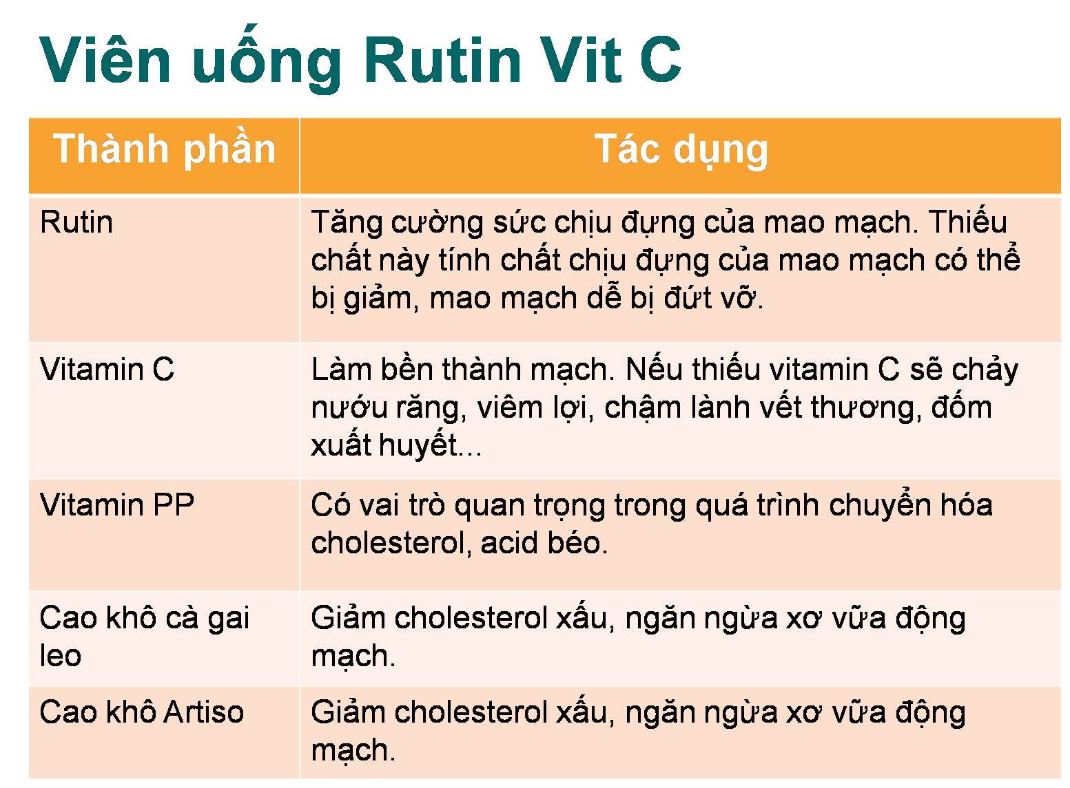 Giúp tăng tính đàn hồi và làm bền vững thành mạch máu, giúp giảm nguy cơ xuất huyết mạch máu, ngăn ngừa nguy cơ như tắc mạch, vỡ mạch, giòn mạch dẫn đến xuất huyết dưới da, hỗ trợ giảm nhiệt miệng, chảy máu chân răng, trĩ.