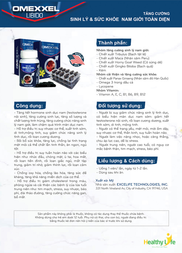 Viên uống tăng cường sinh lý nam giới toàn diện Omexxel Libido sẽ là một lựa chọn an toàn nhất cho sinh lực phái mạnh. Với thành phần là những thảo dược thiên nhiên như Bạch tật lê, Cỏ sừng dê, Nhân sâm Peru… giúp cơ thể tổng hợp hormone sinh dục nam một cách tự nhiên, bổ sung thêm nhiều vitamin và khoáng chất cần thiết cho cơ thể. Sản phẩm đã được nghiên cứu và sản xuất tại Mỹ, với một quy trình nghiêm ngặt.