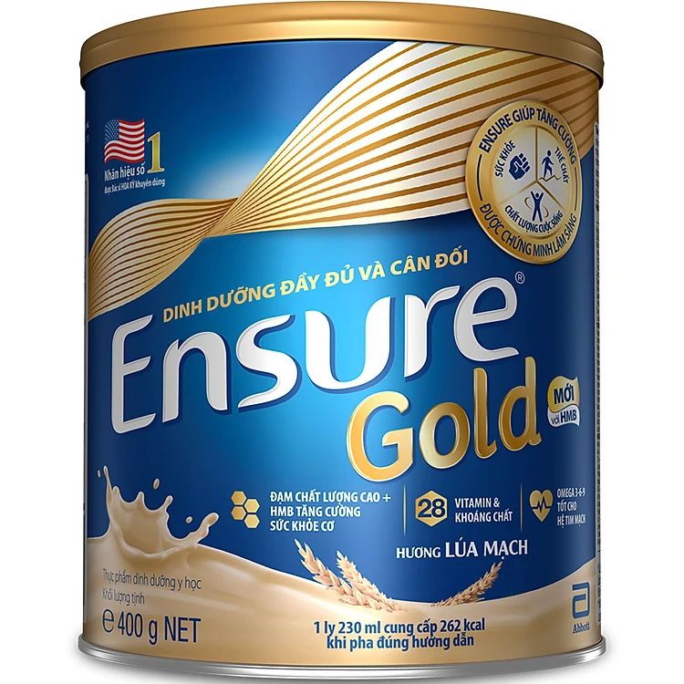 - Sữa Bột Abbott Ensure Gold Hương Lúa Mạch Ít Ngọt 400g thích hợp cho người lớn, người ăn uống kém, đặc biệt cho người bệnh thích hợp cho người lớn, người ăn uống kém, đặc biệt cho người bệnh cần phục hồi nhanh. Được đặc chế với hỗn hợp chất béo giàu PUFA, MUFA tốt cho tim mạch, hàm lượng acid béo no và cholesterol thấp. Ensure Gold cung cấp các acid béo thiết yếu (linoleic và linolenic) có lợi cho chế độ ăn lành mạnh.