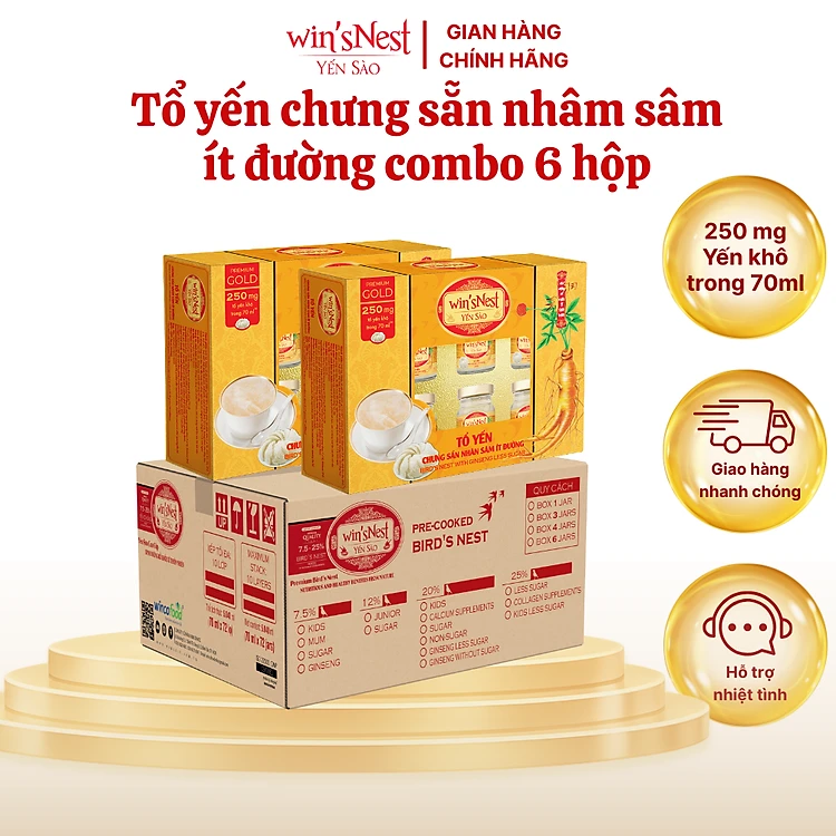 (Thùng 06 hộp) Yến Sào wins'Nest 250mg tổ yến chưng sẵn nhân sâm ít đường (6 Lọ x 70 ml / Hộp)