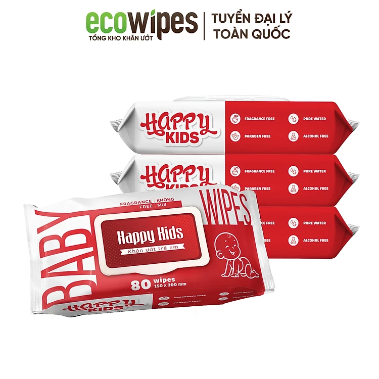 Thùng 10 gói khăn ướt trẻ em Happy Kids Đỏ gói 80 tờ không mùi siêu tiết kiệm cho bé