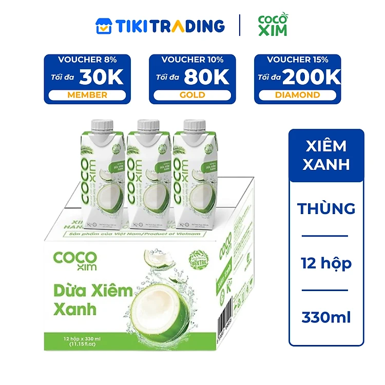 Thùng 12 Hộp Nước Dừa Cocoxim Xanh (330ml x12 Hộp)