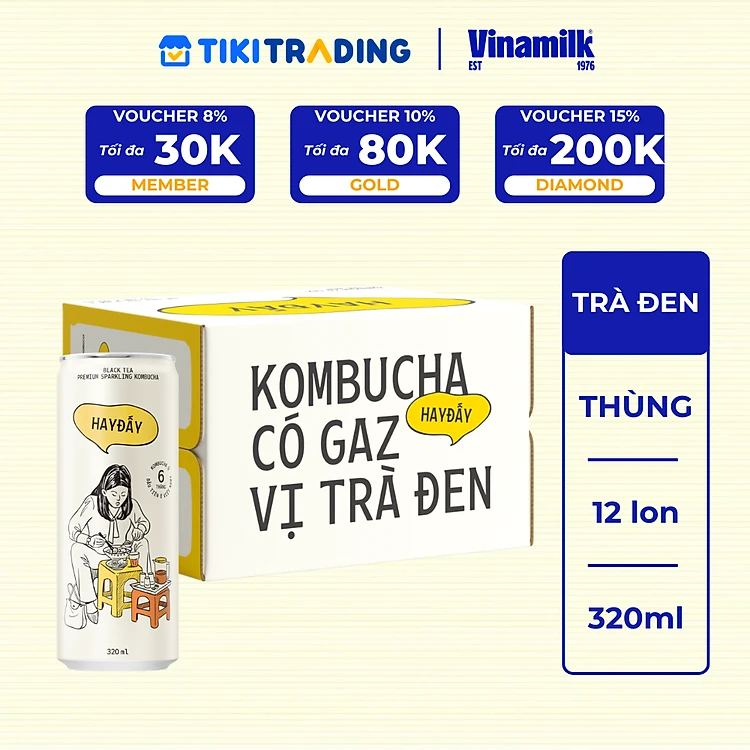 Thùng 12 lon Kombucha Có Gaz Vị Trà Đen HAYĐẤY 320ml