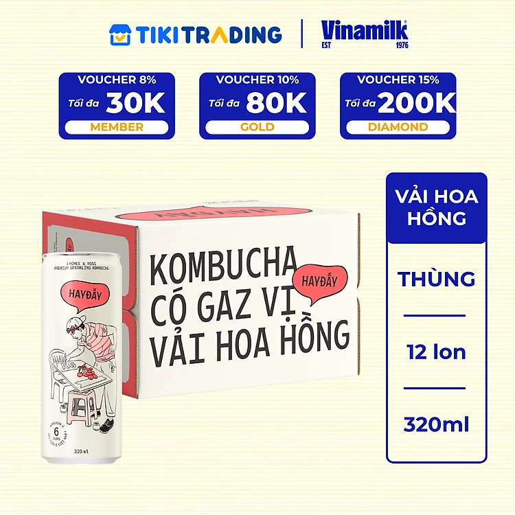 Thùng 12 lon Kombucha Có Gaz Vị Vải Hoa Hồng 320ml