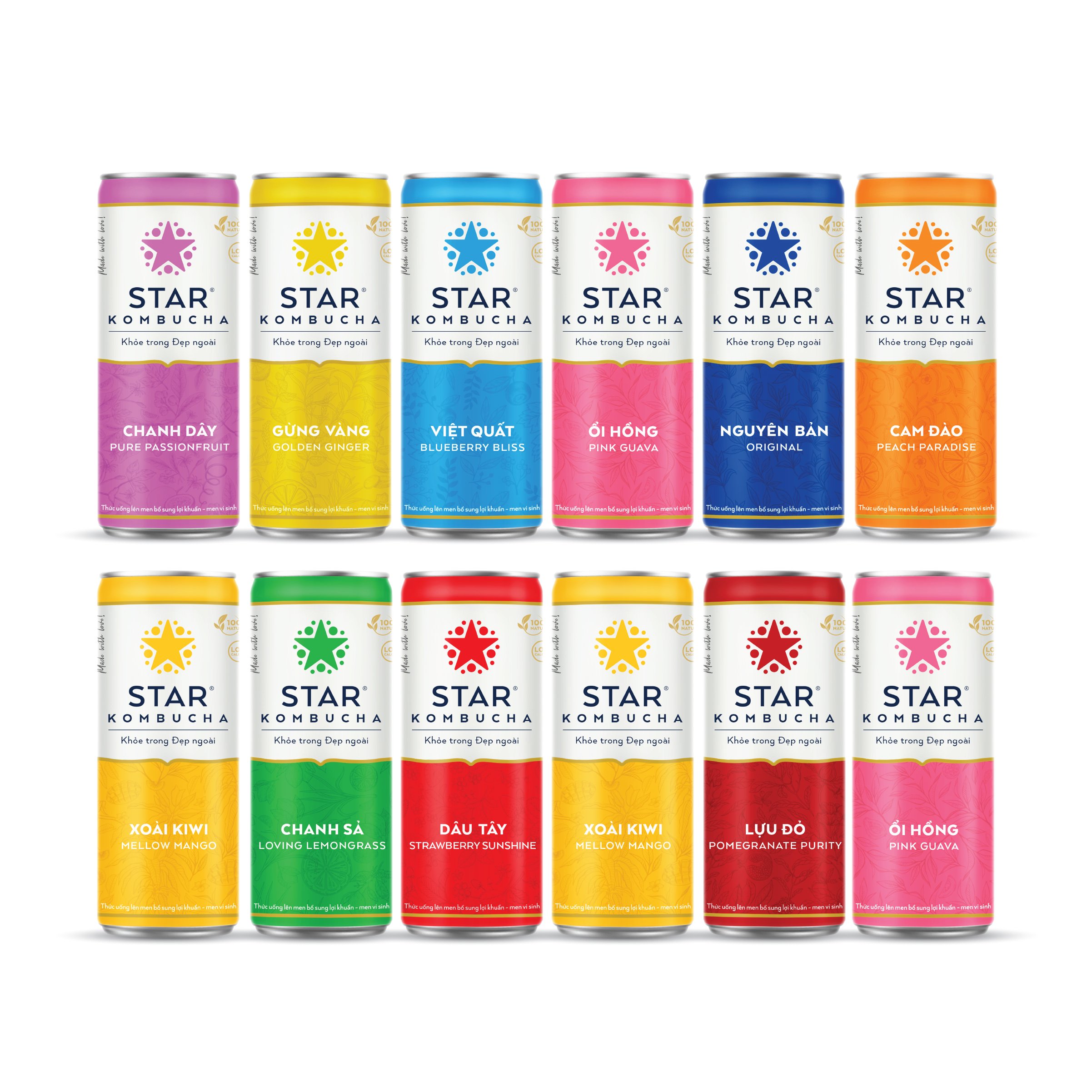 STAR KOMBUCHA All-in-One gồm 10 hương vị: Xoài Kiwi, Ổi Hồng, Lựu Đỏ, Dâu Tây, Cam Đào, Việt Quất, Chanh Sả, Chanh Dây, Gừng Vàng, Nguyên Bản.