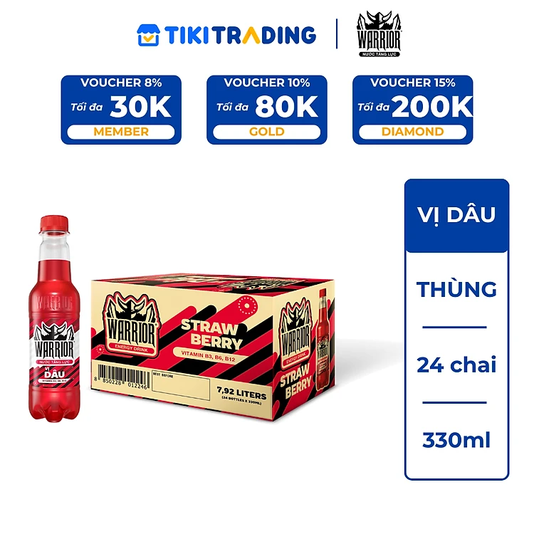 Thùng 24 Chai Nước Tăng Lực Có Gas Warrior Vị Dâu 330ml