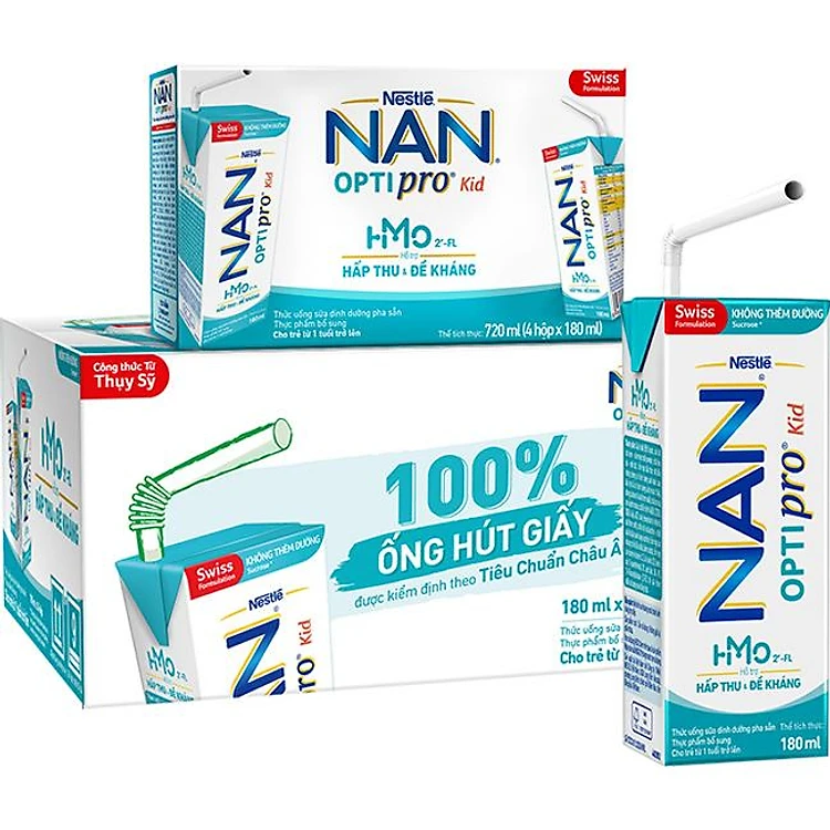 - Nestlé Nan Optipro Kid hộp pha sẵn là sản phẩm dinh dưỡng công thức từ Thụy Sĩ, dành cho trẻ 1 tuổi trở lên. Với công thức mới cải tiến bổ sung HM-O 2'-FL, hỗ trợ hấp thu & đề kháng của trẻ. Chỉ 2 hộp 180ml mỗi ngày, trẻ đã được cung cấp năng lượng và hệ dưỡng chất thiết yếu cho sự phát triển toàn diện của thể chất và trí não.