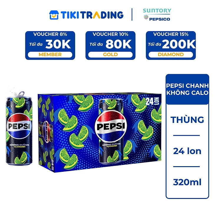 Thùng 24 Lon Nước Uống Có Gaz Pepsi Vị Chanh Không Calo (320ml/Lon)
