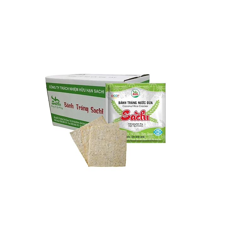 Thùng 25 gói loại 70gram, bánh tráng nước dừa cao cấp nướng sẵn Sachi