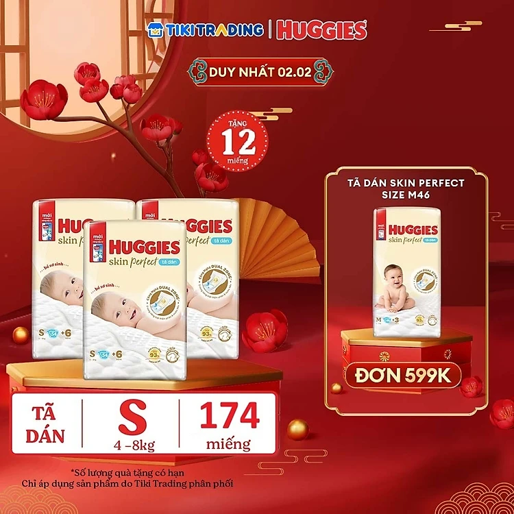 Combo 3 gói Tã/bỉm dán sơ sinh Huggies Skin Perfect S 54+4 miếng với 2 vùng thấm giảm kích ứng da