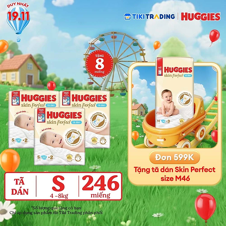 Combo 3 gói Tã/bỉm dán sơ sinh Huggies Skin Perfect S 80+2 miếng với 2 vùng thấm giảm kích ứng da