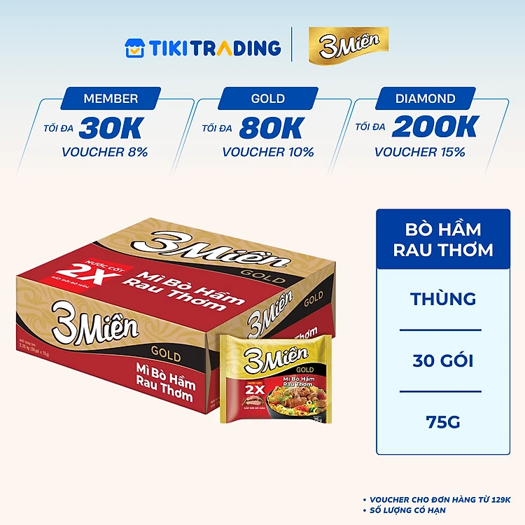 Thùng 30 Gói Mì 3 Miền Gold Bò Hầm Rau Thơm 75g