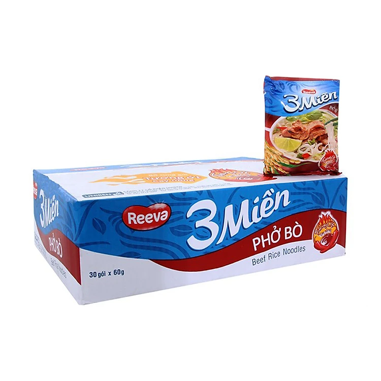Thùng 30 Gói Phở Bò Reeva 3 Miền 65G là lựa chọn hàng đầu khi không có nhiều thời gian dành cho việc nấu nướng. Bạn chỉ cần cho vắt phở và các gói gia vị và tô, chế khoảng 350ml nước sôi, đậy nắp kín và chờ trong 3 phút, cho gói tương ớt vào tô phở theo ý thích và thưởng thức. Vị ngọt của bột thịt kết hợp với hương thơm của hành lá sấy và tương ớt cay nồng tạo nên một tô phở bò thơm ngon đậm đà. Phở bò 3 Miền Reeva mang tới hương vị truyền thống đặc trưng của món phở miền Bắc, phù hợp với mọi lứa tuổi.