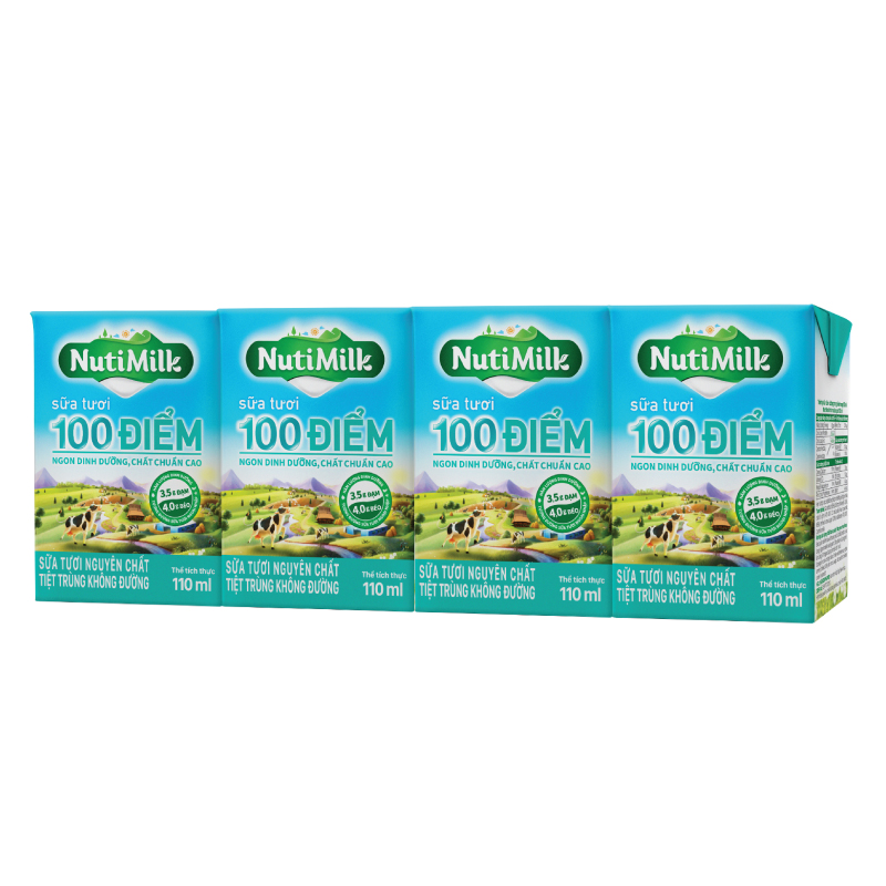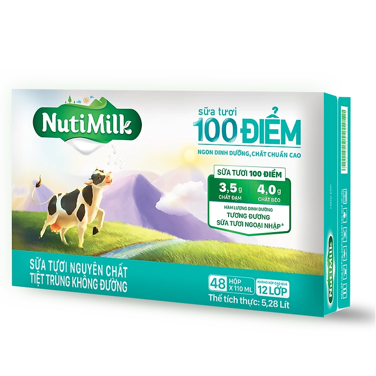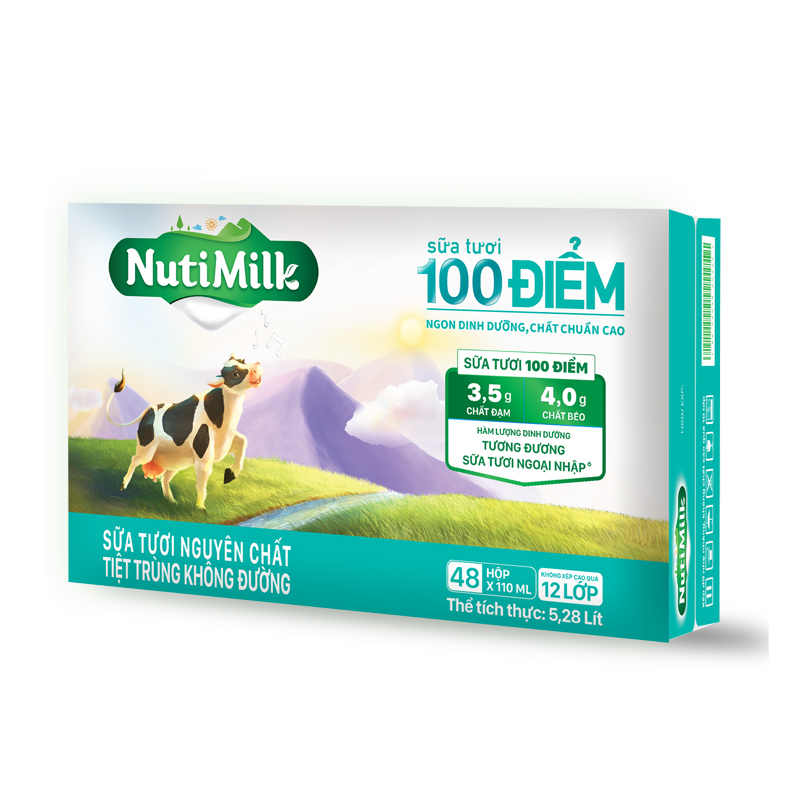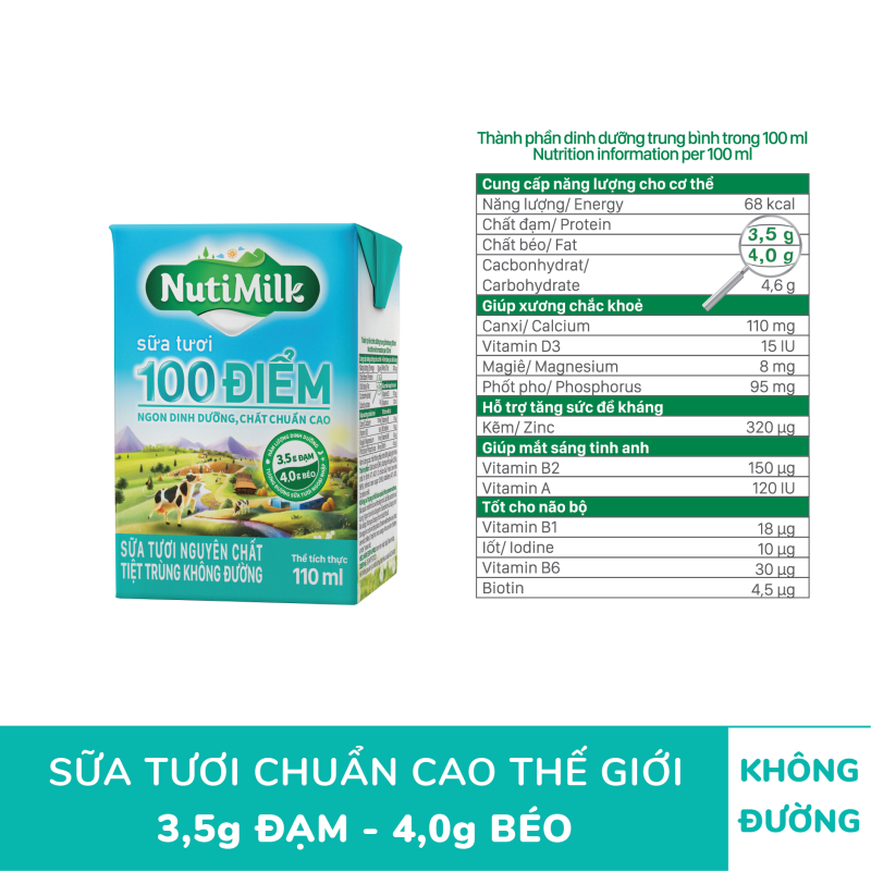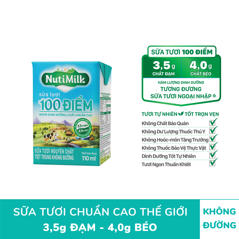 Nhờ thừa hưởng tất cả yếu tố "thiên thời địa lợi nhân hòa" về điều kiện tự nhiên, phương pháp chăn nuôi và sự tham gia của các chuyên gia từ Thụy Điển, dòng sản phẩm NutiMilk Sữa tươi 100 điểm có hàm lượng dinh dưỡng lên đến 3,5g Đạm và 4,0g Béo trong 100 ml, tương đương sữa tươi ngoại nhập.