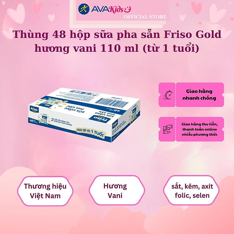 Thùng 48 hộp sữa pha sẵn Friso Gold hương vani 110 ml sử dụng ống hút giấy phiên bản mới, cứng cáp hơn, dễ dàng phân hủy và bảo vệ môi trường