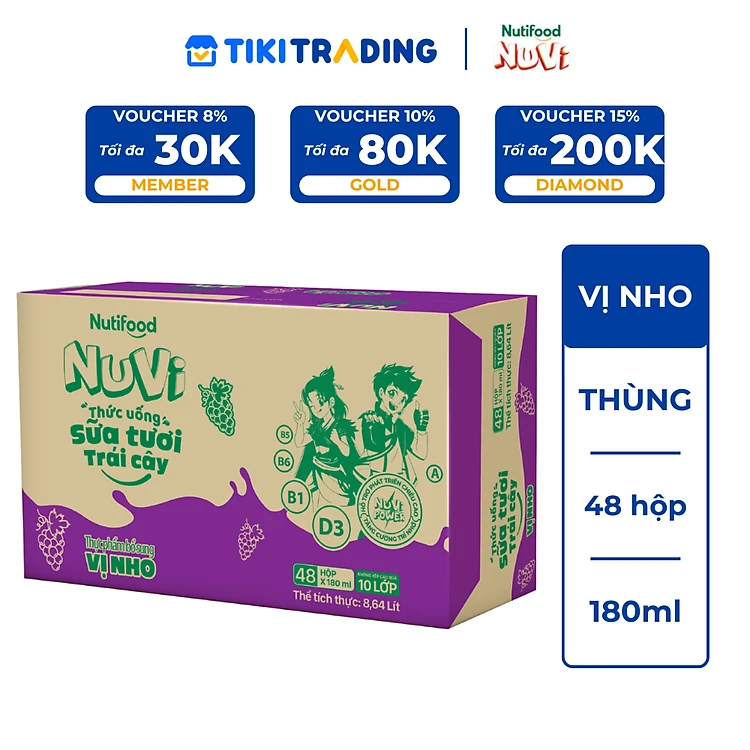 Thùng 48 hộp Thức Uống Sữa Tươi Trái Cây Tươi Nuvi Vị Nho 180ml - Tăng Cường Chiều Cao, Phát Triển Trí Não
