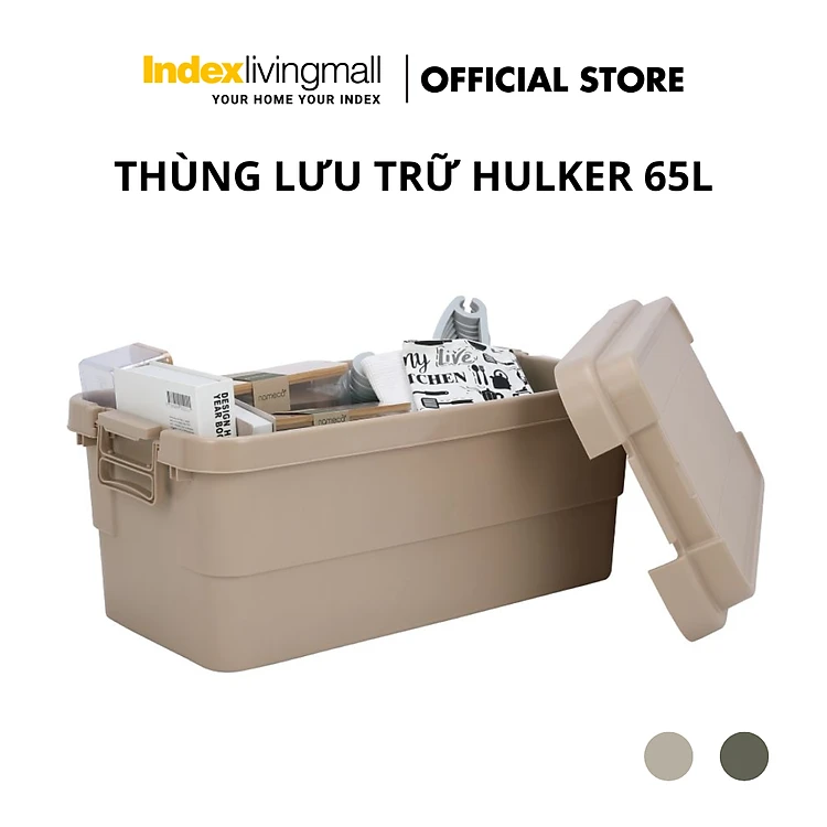 Thùng lưu trữ, hộp đựng đồ đa năng bằng nhựa PP cao cấp 65L HULKER NEW màu KAKI | Index Living Mall