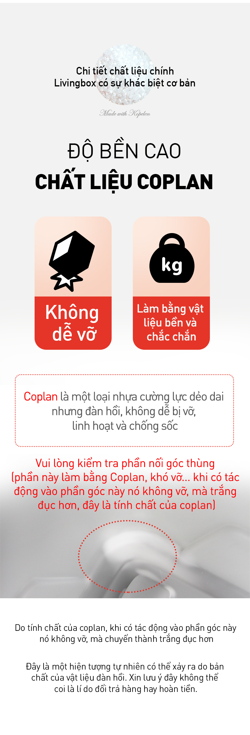 Vui lòng kiểm tra phần nối góc góc thùng (phần này làm bằng Coplan, khó vỡ, khi có tác động vào phần góc này nó không vỡ, mà trắng đục hơn, đây là tính chất của coplan)
