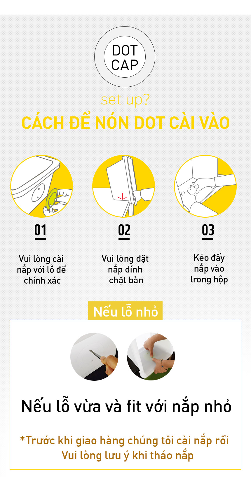 Vui lòng cài nắp chính xác vô lỗ hổng