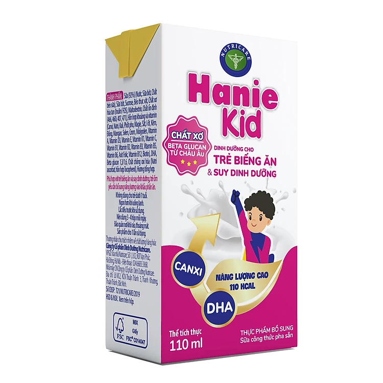 Thùng sữa bột pha sẵn Nutricare Hanie Kid - dinh dưỡng cho trẻ biếng ăn & suy dinh dưỡng trên 1 tuổi (110ml x 48 hộp)
