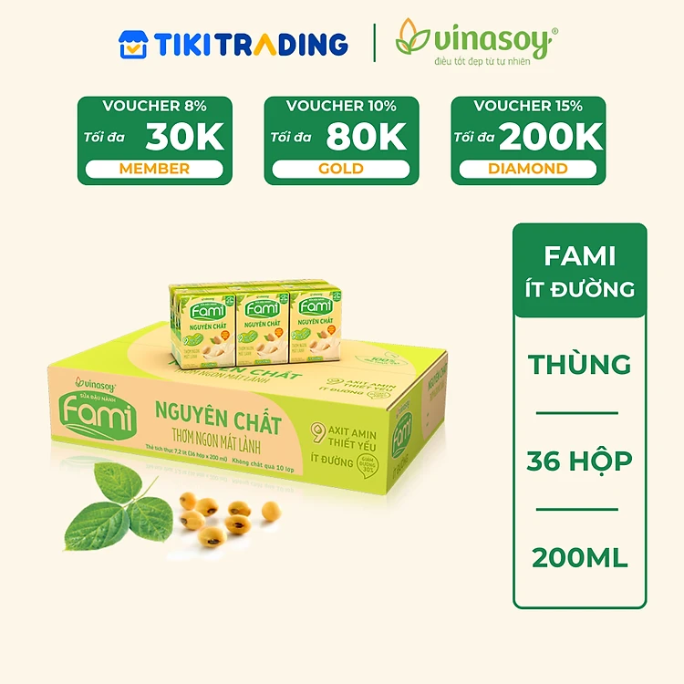 Thùng Sữa đậu nành Vinasoy Fami Nguyên Chất ít đường (200ml x 36 Hộp)
