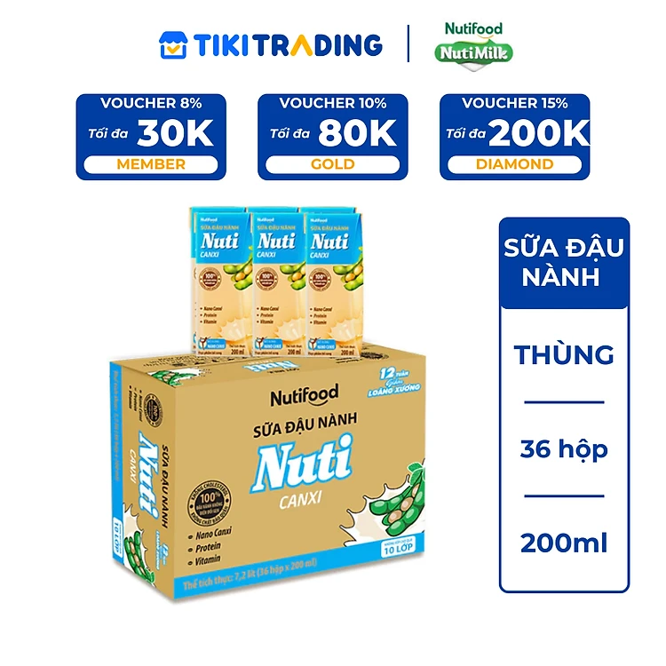 Thùng Sữa Đậu Nành Nutimilk Canxi 200ml (Hộp 200ml x 36) - Bổ Sung Thêm Canxi