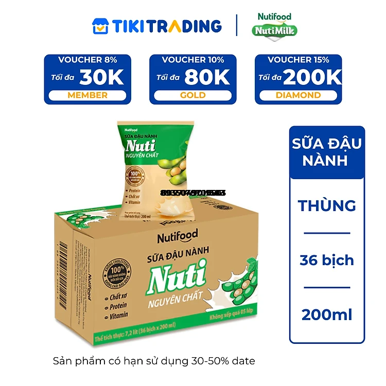 Thùng Sữa Đậu Nành NutiMilk Nguyên Chất 200ml (Bịch 200ml x 36) - Bổ Sung Dinh Dưỡng Từ Hạt Đậu Nành
