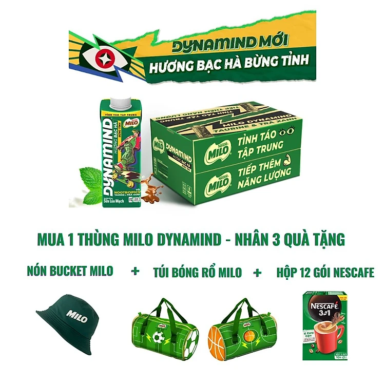 Thùng sữa lúa mạch Nestlé MILO Dynamind Bạc Hà thùng 24 hộp x 200 ml (24x200ml) [Tặng 1 nón bucket Milo + 1 túi đeo chéo bóng rổ Milo + Hộp 12 gói Cà phê 3in1 Vị Rang Đậm]
