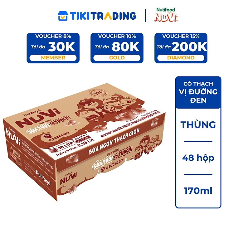 Thùng Sữa Tươi có Thạch vị đường đen Nuvi 170ml (48 Hộp x 170ml) - Phát Triển Chiều Cao, Tăng Cường Trí Nhớ