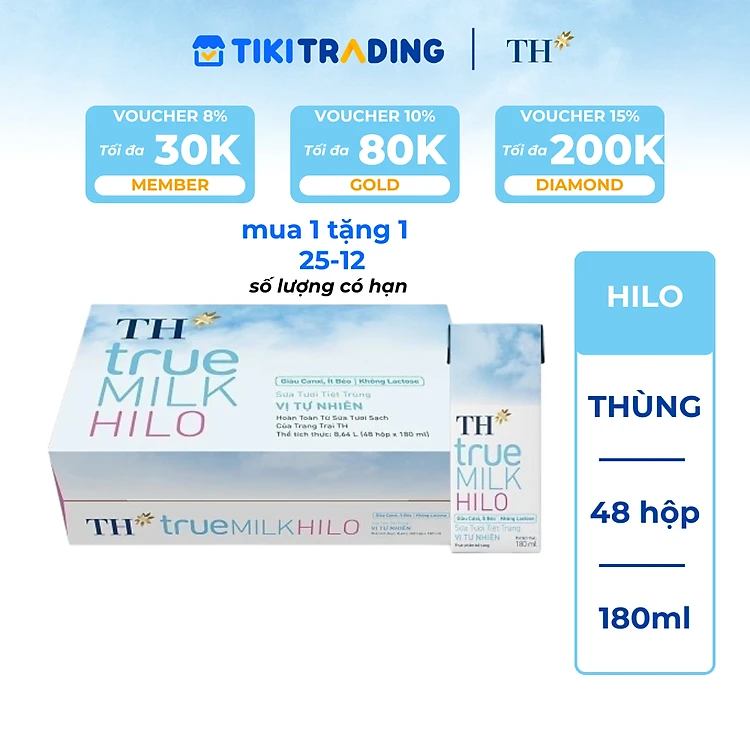 Thùng 48 hộp sữa tươi tiệt trùng TH True Milk HILO vị tự nhiên 180ml