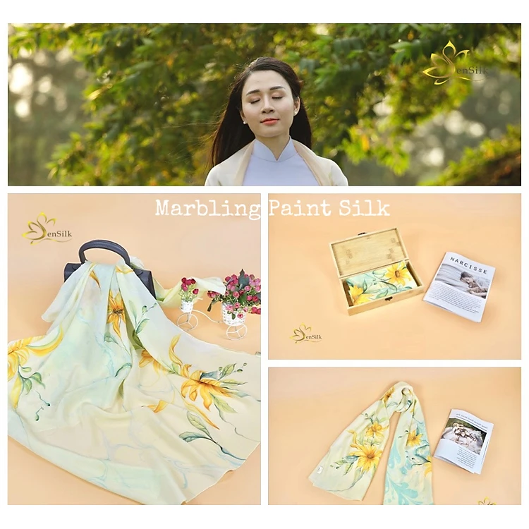Thủy Ấn Họa Trên Lụa Hoa Dã Quỳ – Water Marbling Silk, Khăn Lụa Cao Cấp