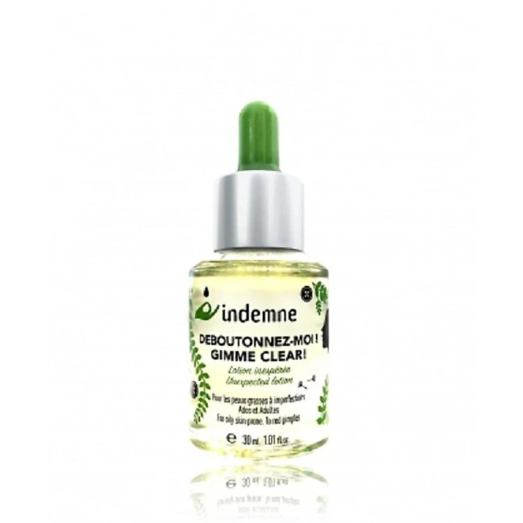 GIMME CLEAR Lotion dành cho da nhờn và da mụn từ Indemne, với giải pháp hiệu quả từ thiên nhiên hỗ trợ điều trị và phòng ngừa mụn trứng cá trên da nhờ tác dụng kháng viêm, kháng khuẩn, loại trừ vi khuẩn gây mụn và làm giảm tổn thương da do mụn.