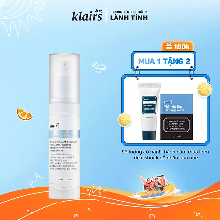 Tinh chất Dear, Klairs Freshly Juiced Viatmin Charging Serum 30ml là phiên bản Vitamin C cải tiến, nổi trội với 10% EAA có khả năng hỗ trợ dưỡng da sáng đều màu, tăng độ đàn hồi và giảm hình thành nếp nhăn. Đây là phiên bản Vitamin C cải tiến đã khắc phục được hạn chế của Vitamin C tinh khiết