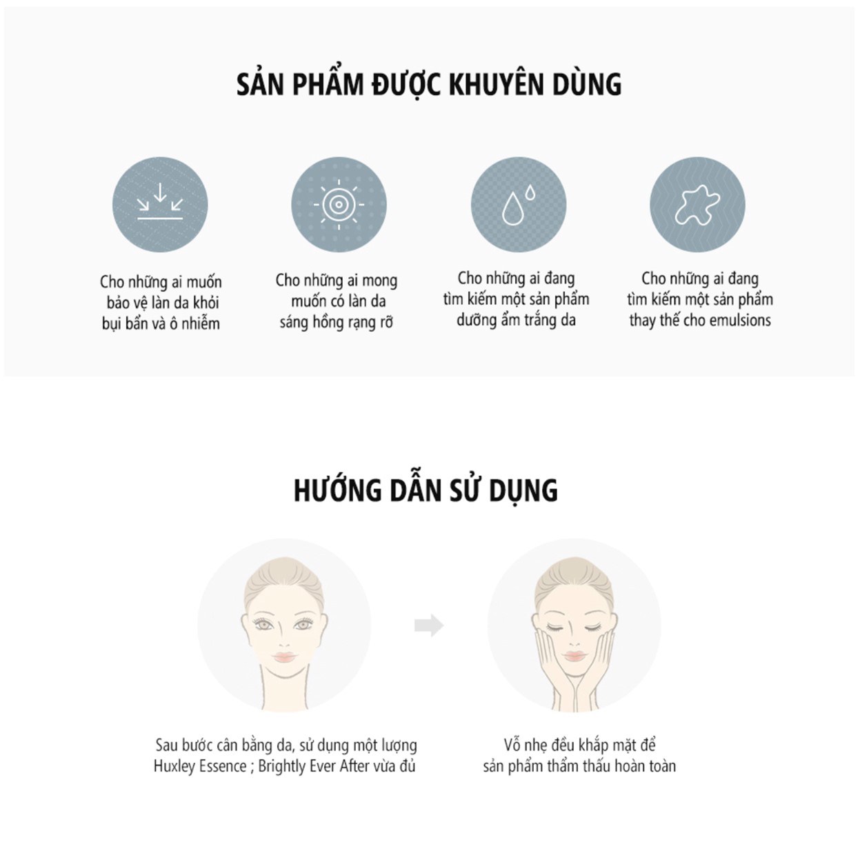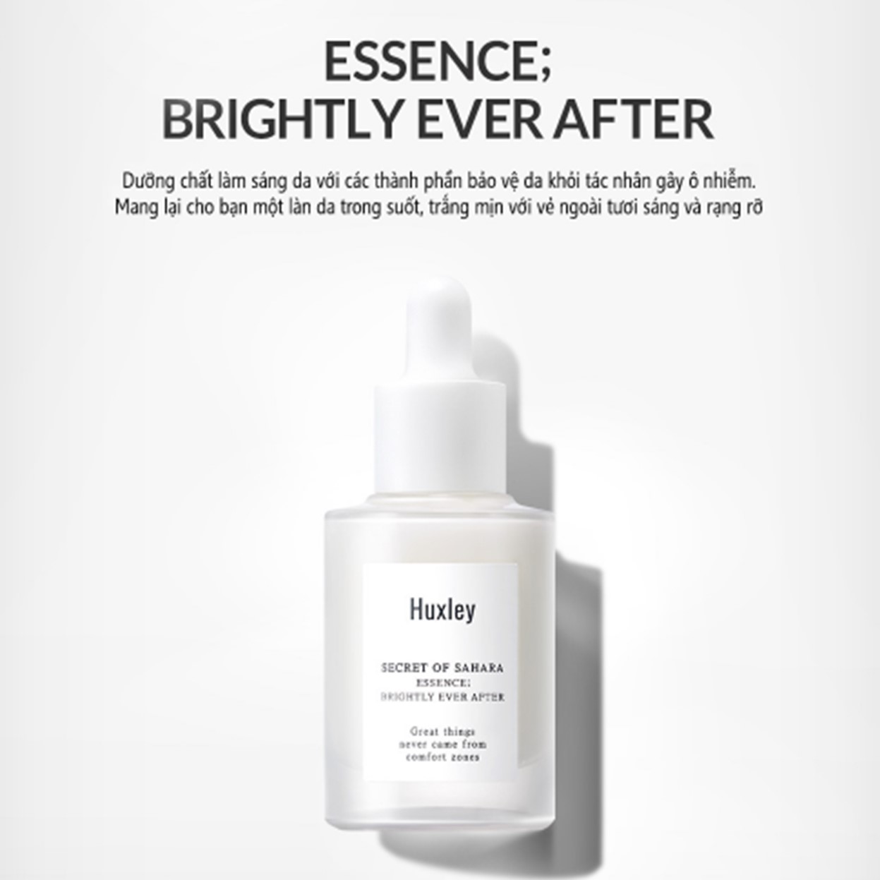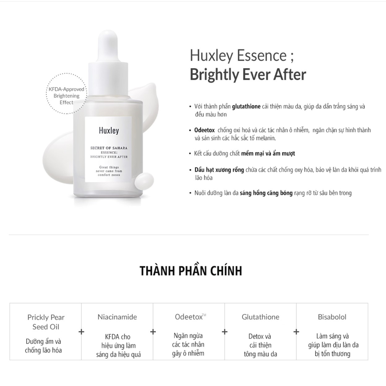 Tinh Chất Dưỡng Trắng, Cải Thiện Đốm Nâu Và Khuyết Điểm Trên Da Huxley Essence; Brightly Ever After với chiết xuất từ các thành phần thiên nhiên, giàu chất dưỡng trắng da, bảo vệ da khỏi tác nhân gây ô nhiêm và oxy hóa làn da. Huxley Essence; Brightly Ever After cung cấp độ ẩm cần thiết và cung cấp dinh dưỡng cho làn da, đảm bảo cho da trong suốt, trắng mịn với vẻ ngoài tươi sáng và rạng rỡ.