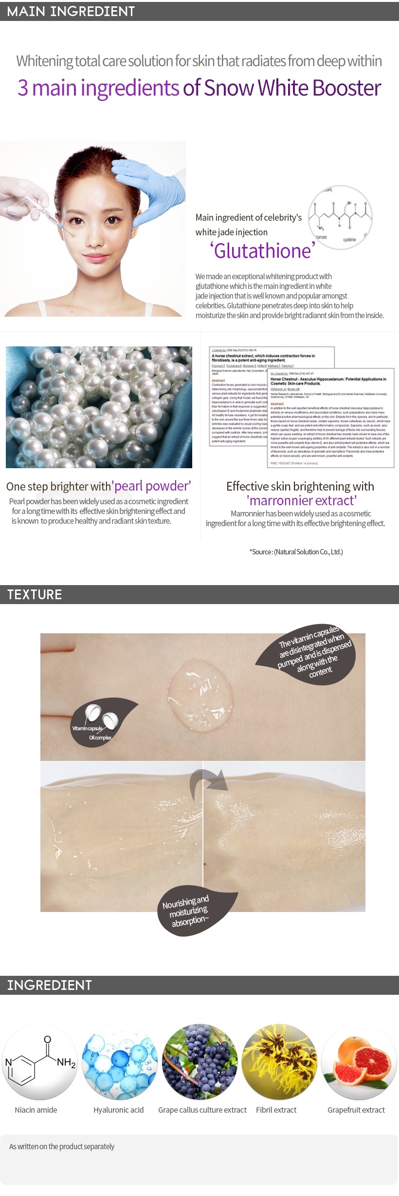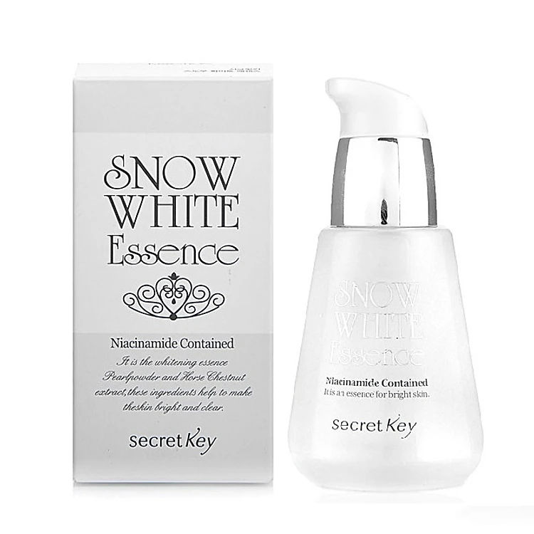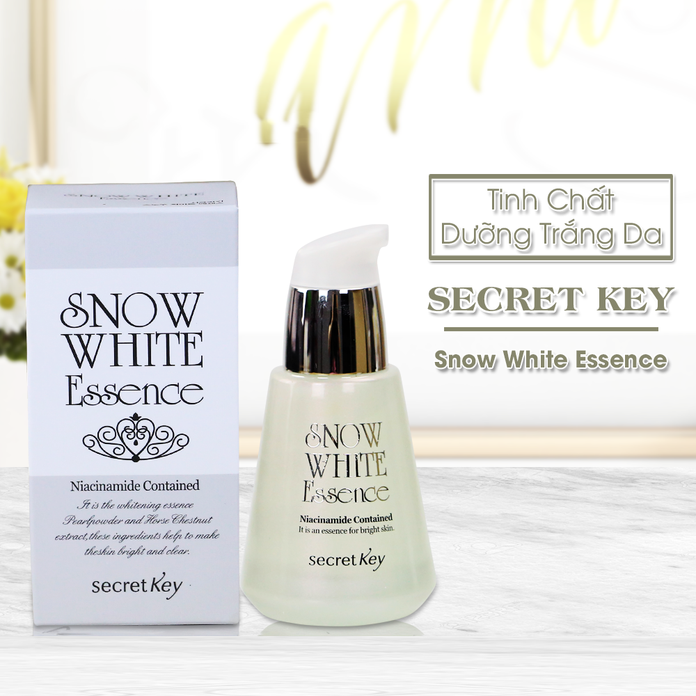 Tinh chất dưỡng trắng da Secret Key Snow White Essence chứa thành phần tinh bột Ngô, bột Ngọc trai tự nhiên, Hạt dẻ ngựa, tế bào thân cây nho có công dụng dưỡng trắng da hiệu quả. Đặc biệt, vitamin cô đặc ở mức độ cao có trong tinh dầu sẽ nhanh chóng thấm sâu vào da, cải thiện sức khỏe da và làm đều màu da.