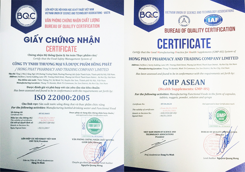 Giấy chứng nhận tiêu chuẩn GMP và ISO cho Dược Phẩm Hồng Phát – Nơi Hàu Oyster Man được sản xuất