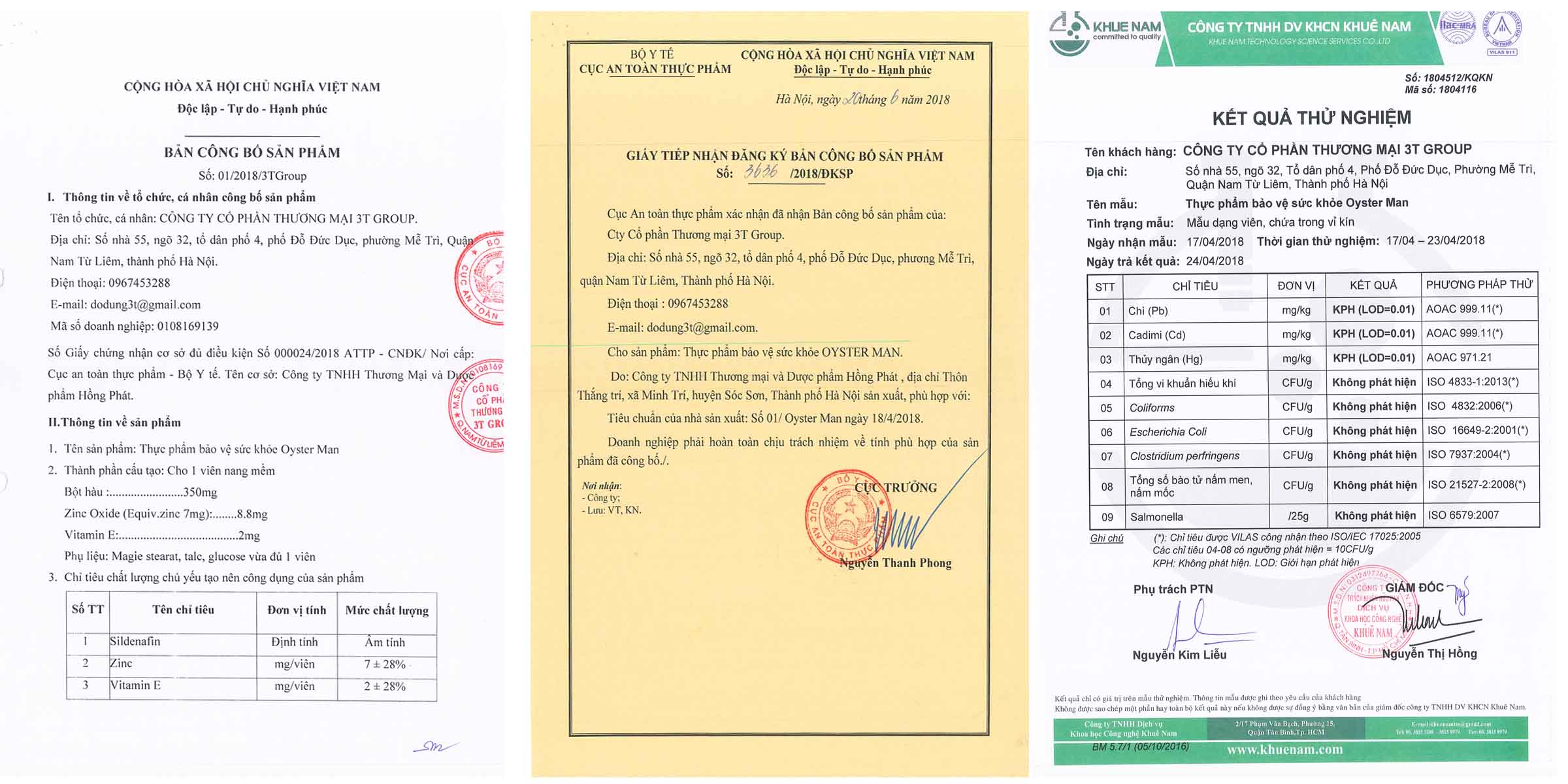 Oyster Man với đầy đủ chứng nhận công bố và kiểm nghiệm chất lượng sản phẩm của Bộ Y tế
