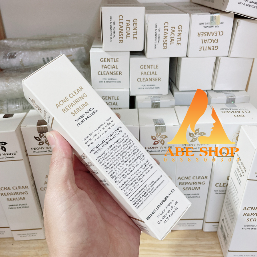TINH CHẤT PEONY WHITE MỤN - ACNE CLEAR REPAIRING SERUM, se khít lỗ chân lông nhập khẩu Australia chính hãng. Sản phẩm hỗ trợ dùng cho quá trình giảm mụn hiệu quả, nhanh chóng. Tinh chất thiên nhiên không chỉ lành mụn mà còn giúp làm mờ vết thâm, trắng da.