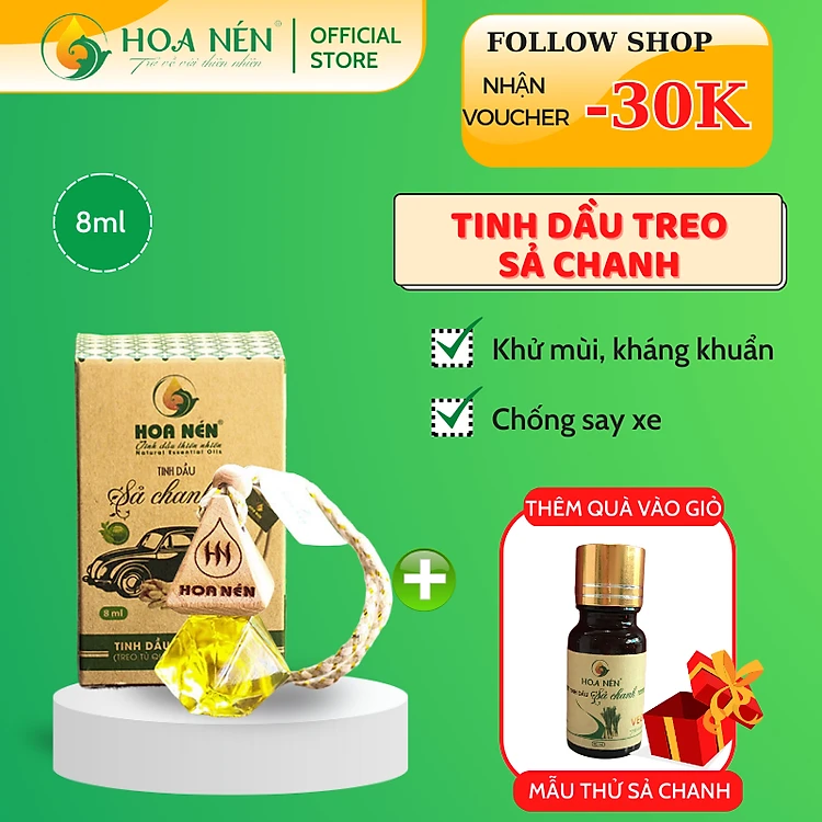 Tinh dầu treo Sả Chanh nguyên chất Hoa Nén 8ml- vegan - Khử mùi phòng vệ sinh, phòng bếp, chống say xe