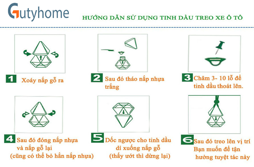 Treo xe trong ô tô - Với cấu tạo lọ thủy tinh nhỏ gọn chứa tinh dầu nguyên chất, mỗi một lọ sẽ bao gồm một hộp, lọ đựng tinh dầu, nắp nhựa và một kim găm. - Bạn sử dụng kim găm đục 3-4 lỗ trên nắp nhựa. - Vặn chặt nắp gỗ lại và dốc ngược lọ tinh dầu để tinh dầu thấm ra nắp gỗ. - Treo vào gương xe hoặc bất cứ khu vực nào có chuyển động. - Tinh dầu sẽ thấm vào nút gỗ và khuếch tán ra không khí. Giúp bạn khử mùi hôi của xe, chống say xe, buồn nôn, giảm cảm giác khó chịu khi đi xe.