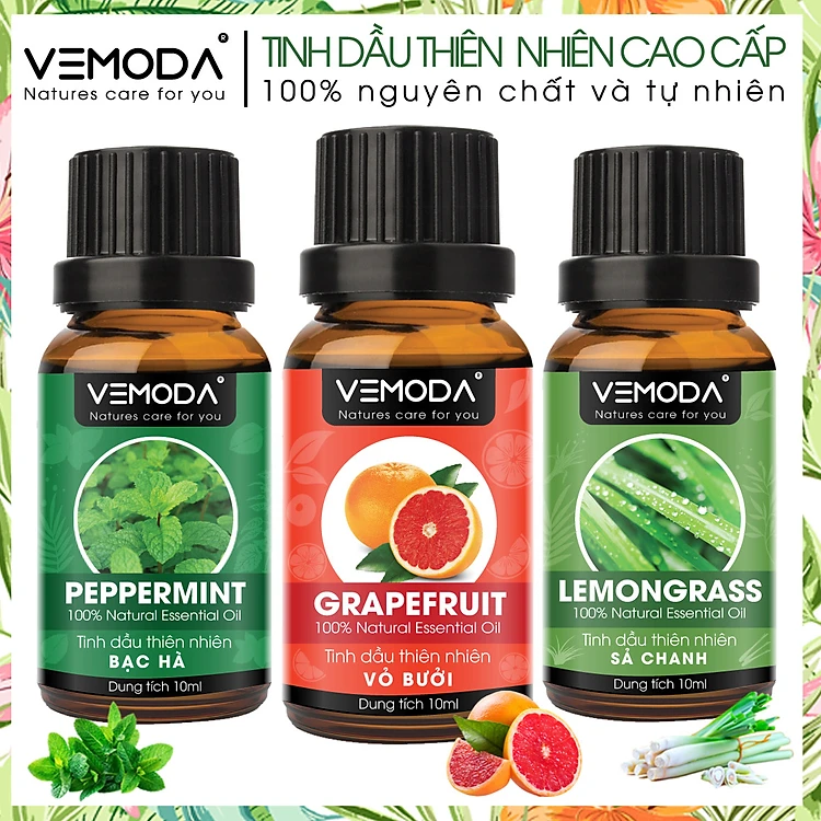 Tinh dầu xông phòng cao cấp gồm 3 chai tinh dầu nguyên chất Vemoda: tinh dầu Sả chanh (10ml) + tinh dầu Vỏ bưởi HG (10ml) + tinh dầu Bạc hà (10ml)