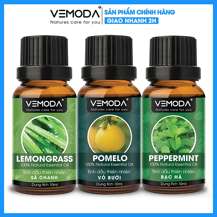Tinh dầu xông phòng gồm 3 lọ tinh dầu nguyên chất cao cấp Vemoda: tinh dầu Vỏ bưởi MG (Ấn) + tinh dầu Bạc hà (Ấn) + tinh dầu Sả chanh (Ấn)