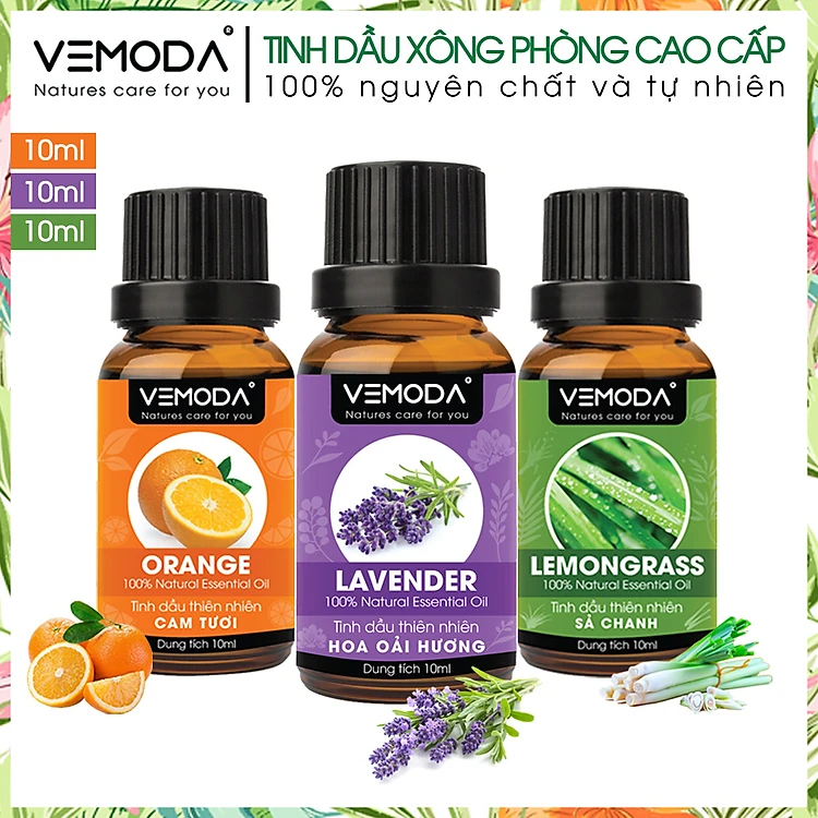 Tinh dầu Xông phòng gồm Combo 3 lọ tinh dầu cao cấp: tinh dầu Sả chanh (10ml) + tinh dầu Oải hương (10ml) + tinh dầu Cam tươi (10ml) Vemoda
