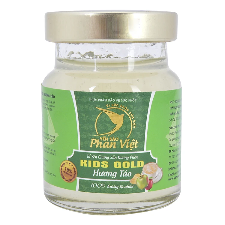 - Tổ Yến Chưng Sẵn Đường Phèn Yến Sào Phan Việt Kids Nest Gold Hương Táo (70ml) - Sản phẩm được sản xuất trên dây chuyền khép kín và hoàn toàn tự động, không phẩm màu và chất bảo quản, và đạt tiêu chuẩn an toàn vệ sinh thực phẩm.