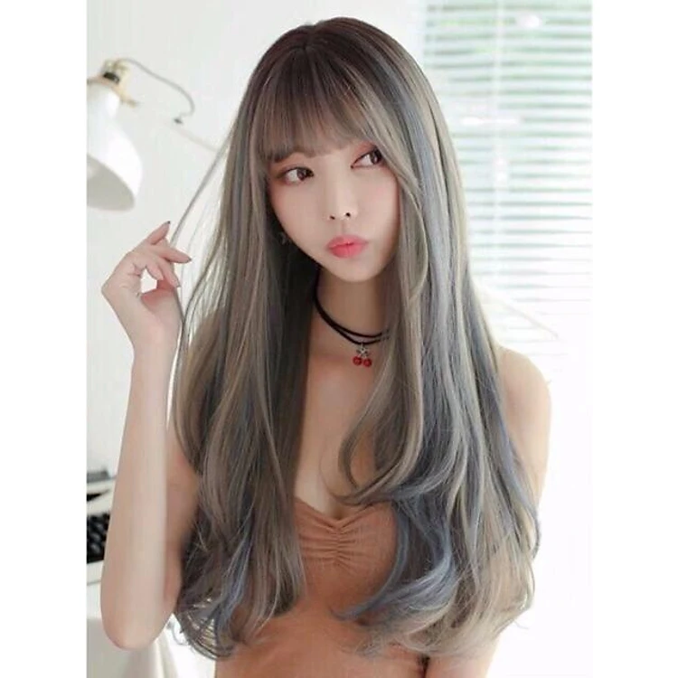 tóc giả cao cấp nhuộm chân đen xám line xanh- tặng lưới chùm tóc