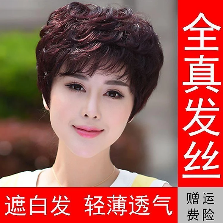 Tóc giả người thật Tóc giả nữ tóc giả nữ tóc ngắn tóc xoăn ngắn tóc thật bộ tóc giả trung niên và người cao tuổi tóc thật tự nhiên mẹ thời trang trùm đầu đầy đủ