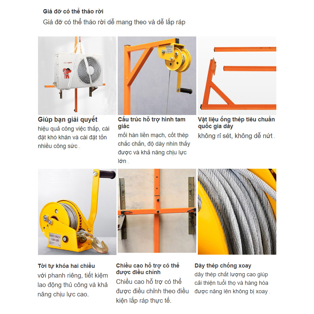 Thông số kĩ thuật: Bộ Bao Gồm Cả Tời Quay Tay Tự Hãm, Có Đảo Chiều Và Khung Nâng Hạ Dàn Nóng Điều Hòa